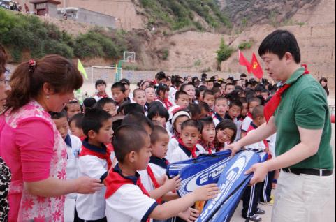 我校扶贫队队长李志荣代表百名学子把捐赠物品送到小学学生手中