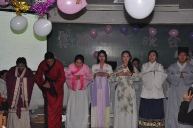 朝歌汉服社也为欢迎新生奉献了一场独特魅力的汉服T台秀。这是本次晚会的一大亮点,汉服社的社员们通过生动地舞台表演形式,弘扬了纯善纯美又充满神秘的民族传统服饰——汉服!学院学生会主席高盛,也为新生奉唱歌曲《归》,再一次点燃晚会的热情。整场晚会歌曲、舞蹈、相声及观众游戏互动等节目缤纷精彩,尽显大学生多姿多彩的青春活力与高涨激情,使入学新生感受和体会到同人动漫