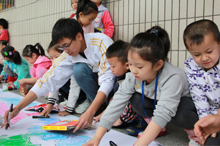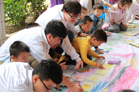 学生与小朋友们合影留念,并用大家共同完成的十二幅巨画作拼成了“六十五”的字样,庆祝国庆65周年。至此,此次活动圆满结束,小朋友和美院的师生结下了深厚友谊,立志要以各位大哥哥大姐姐为榜样,好好学习,早日成为一名合格优秀的大学生。
