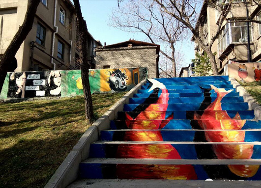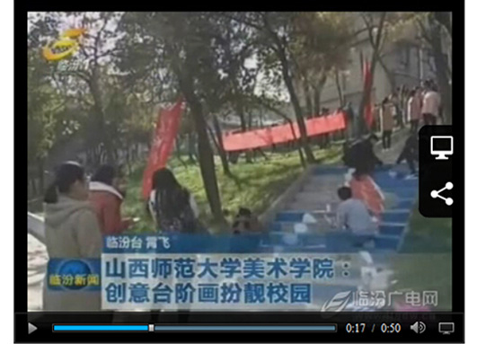 11月16日,院团委及美术空间社团策划、组织100余名学生在莳英园入口阶梯处举办以“缤纷画笔 靓丽校园”为主题的涂鸦彩绘活动,扮靓冬日校园,打造美院特色团日活动,营造丰富校园文化氛围。此次活动根据场地,参与的同学们创作了大量丰富多彩、别具特色、彰显个性的台阶画,主题从字体、人物、动物、到风景等各不雷同。整个过程中,一根根画笔在同学手中灵活的飞舞,一块块鲜明的色彩在墙面上、地面上热情的跳跃,加上现场动感的音乐,飞扬的彩旗,好不热闹。要说最亮点的作品,就要属占据了整整二十多阶台面的3D飞鱼画面。构图上,智慧的小艺术家们,利用每层台阶的立面,从竖向的视觉效果上,拼合出一副具有真实性与立体性相结合的完整画面。画面中四条红白锦鲤相间,穿游飞梭,快速前行,栩栩如生,象征着莘莘学子在激流的学海中奋发激昂、你追我赶的学习势头。精彩的活动吸引了来往众多师生、游客的驻足欣赏及参与,也吸引了临汾新闻、临汾晚报、师大校报等媒体的关注和报道。