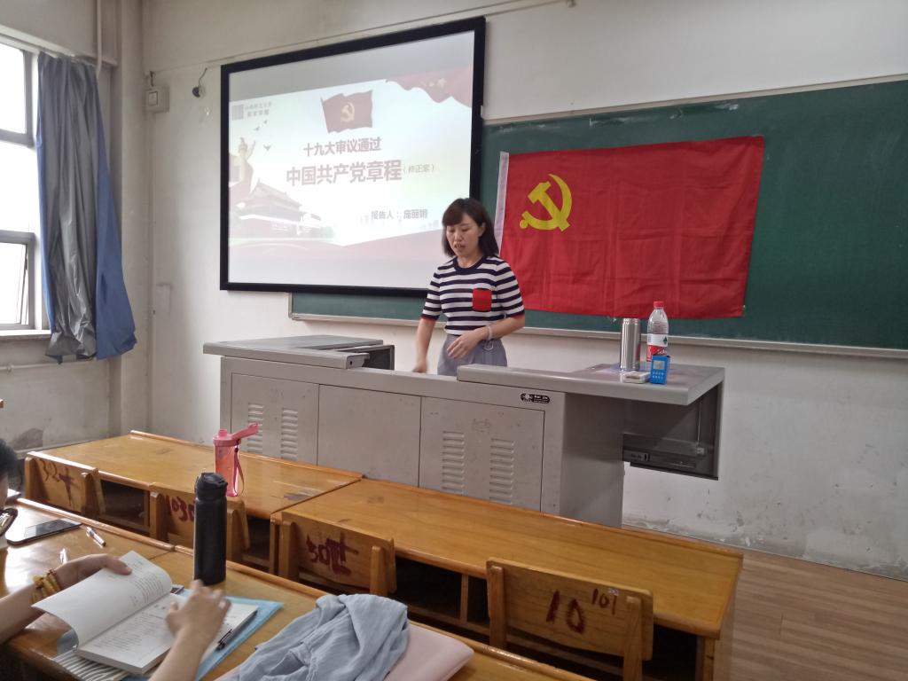 5月19日下午庞丽娟老师讲述了中国共产党章程(修正案),她通过解读党章的发展历程、十九大对党章的修改及新党章的内容。提高了同学们的党章意识,使其坚定共产主义理想信念,不忘初心永跟党走。