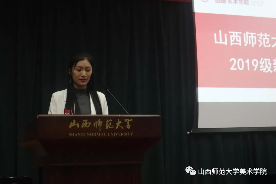 大会第三项,由1801班周韵同学作为老生代表上台发言。她总结了自己一年来在美院所感悟到的体会,感谢美院所提供的平台。同时她也表示希望所有的新同学可以共同建设我们的大家庭,让自己大学四年生活绚丽多彩。