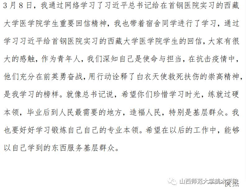 学工组更好地夯实工作基础,落实思想引领指明了方向。学院全体学生纷纷表示将牢记习近平总书记嘱托,珍惜学习时光,筑牢理论根基,练就过硬本领,提升实践能力,永葆初心、勇担使命,服务基层、造福群众,为全面打赢防疫攻坚战贡献青春力量!