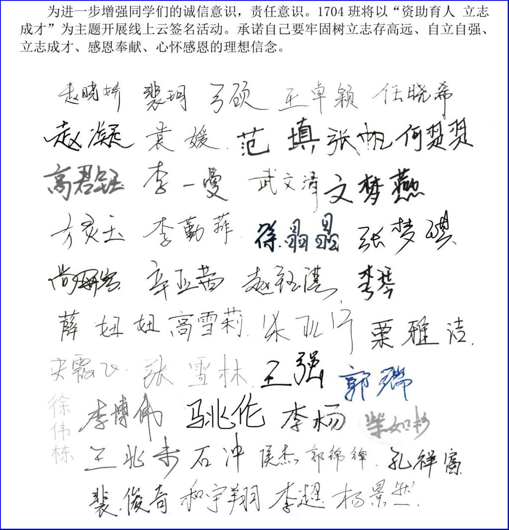 各班级于线上举办了以“资助育人 立志成才”为主题的签名仪式。同学们自发地在宣传语上留下自己的名字,表明自己牢固树立志存高远、自立自强、立志成才、感恩奉献、心怀感恩的理想信念以及推进学院学生资助工作持续健康发展的承诺和决心。