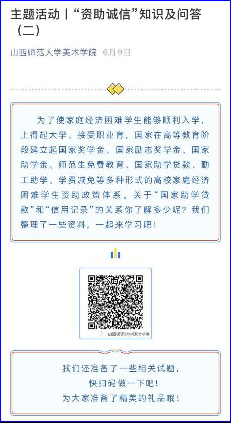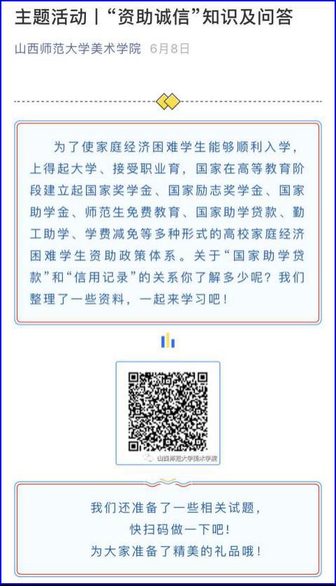面向全院分四期开展了线上诚信教育知识及金融安全知识竞赛,通过制作H5页面在学院公众号推送普及相关征信金融知识,知识竞赛采用积分赛制,题目来源于国家助学贷款相关文件、防止诈骗应知应会知识等。活动的开展让同学们在回答问题的同时,巩固、学习有关助学贷款和金融安全的政策知识,培养了同人动漫