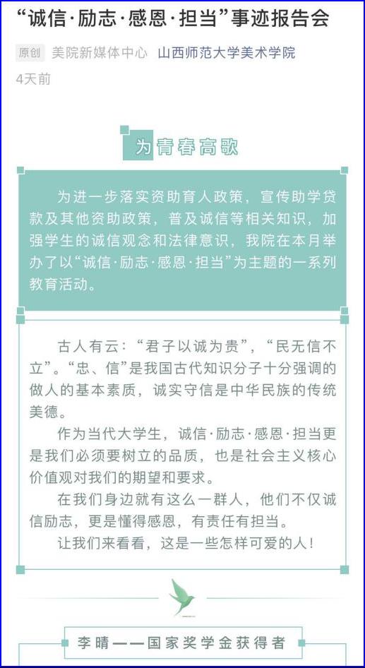 形成了一个诚实守信、感恩奉献的良好氛围,丰富了学生的文化生活,在学生中间树立了励志成才的远大奋斗目标,使诚实守信逐渐成为广大学生自觉遵守的行为准则,有利于推进校园资助工作的顺利开展。学院将持续将培养学生诚信意识作为学生思想教育的重要环节,将诚信宣传进行到底!