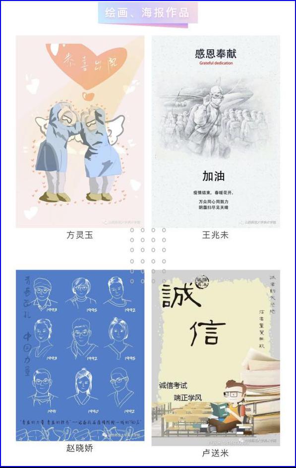 学生共创作主题作品150余幅,作品内容紧扣主题,作品角度覆盖了自强成长、自立成才、青春战“疫”等多角度下的励志、疫情期间身边的诚信故事、励志故事,此次主题创作活动的开展培养了我愿广大学生的识恩、知恩、感恩意识,同学们纷纷表示在以后的生活、学习中会以实际行动感恩祖国、传递爱心、回报社会、充分展示新时代青年的初心使命和情怀担当。