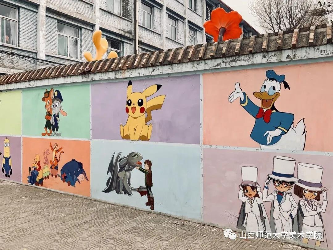 几箱颜料,几把凳子,同学们讨论好分组就井然有序地动起手来。活动过程中每个人都聚精会神地完成自己负责的部分,他们运用娴熟的技巧勾勒出一根根流畅的线条。经过一天的绘制,一个个鲜活的动画形象跃然墙上,成为了校园里一道亮丽的风景线。
