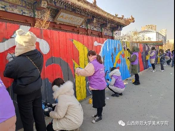天气严寒挡不住同学们高涨的创作热情,每一笔每一画都抒发了美院学子对生活的热爱,对美丽城市的祝福。有趣的形态,浓郁的色调,展示出了同学们的精湛技艺,他们用画笔展现青春风采,用颜料点亮城市色彩。
