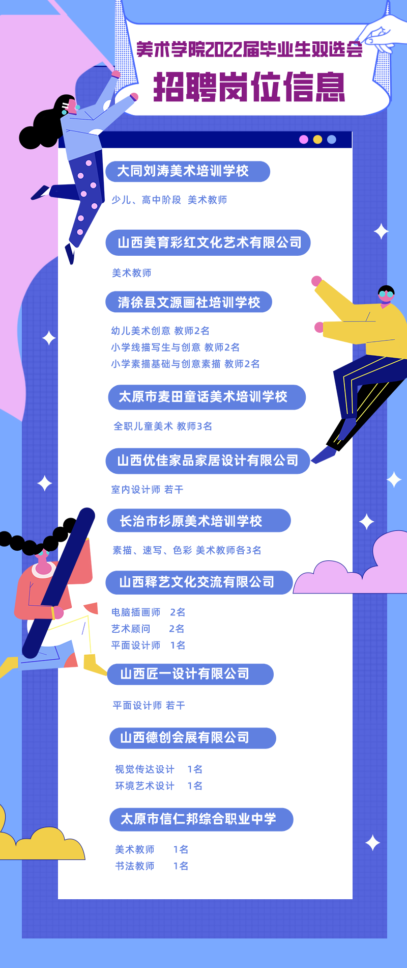 本次双选会是在学院党政领导亲自联系对接推动下举办的,得到了广大用人单位的大力支持,共邀请到设计公司、中小学校、教育培训方面的10多家用人单位参会,提供就业岗位约40余个,有力地支持与保障了此次线上双选会的顺利开展,为疫情下求职受限的在校毕业生们创造了良好的就业条件,提供了多元化的选择机会。