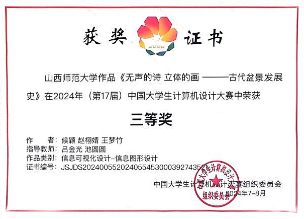 学生候颖、赵栩婧、王梦竹(指导教师:吕金光、池圆圆)提交的参赛作品《无声的诗 立体的画——古代盆景发展史》,经过现场作品演示,答辩质询环节,最终喜获全国三等奖。此外,同人动漫