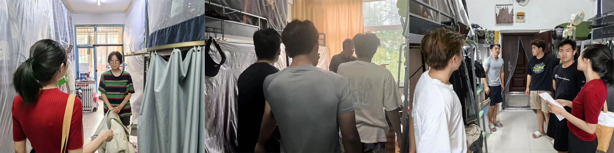 两位老师来到留校学生宿舍,亲切地与同学们交谈,向留校同学了解询问考研考公、实习和暑期实践活动、校园暑期生活服务设施满意度等方面的情况,并勉励同学们要抓住暑期黄金时间,科学规划未来职业发展,努力奋斗。此外,刘宏超副书记还特别强调了校园安全的重要性。他提醒留校学生要注意宿舍消防及用电安全,严格遵守学校暑期留宿管理规定及校规校纪,不要在宿舍吸烟;同时,要提高警惕,外出锁好门窗,保护好自己的个人财产安全,叮嘱同学们,遇到突发紧急情况要第一时间向辅导员和学院报告,确保自身生命安全。
