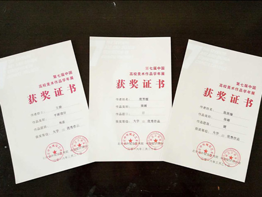 设计专业2013级学生王涛作品《味道》、油画专业2014级学生庞芳媛作品《祥》、张欣瑜作品《媛》分别荣获大学组优秀作品证书。