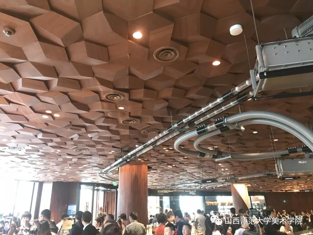独具特色的空间设计。天花板由1万块6边型木头铺设而成,设计灵感源自意式浓缩咖啡机的增压手柄。