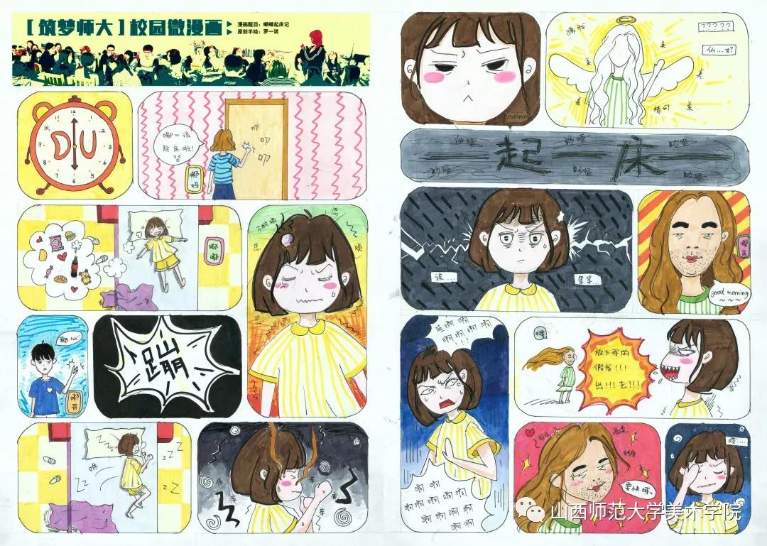 17级视觉传达班在《插画设计》课程上的结课作业。所有作品从故事脚本到漫画表现都来自同学们的亲手原创。在漫画中,我们看到师大的篮球赛,啦啦操训练、合唱比赛、社团活动、上课时的糗事、宿舍中的囧态……这些漫画故事都取材自同学们生活中真实发生的小状况,是不是代入感十足?