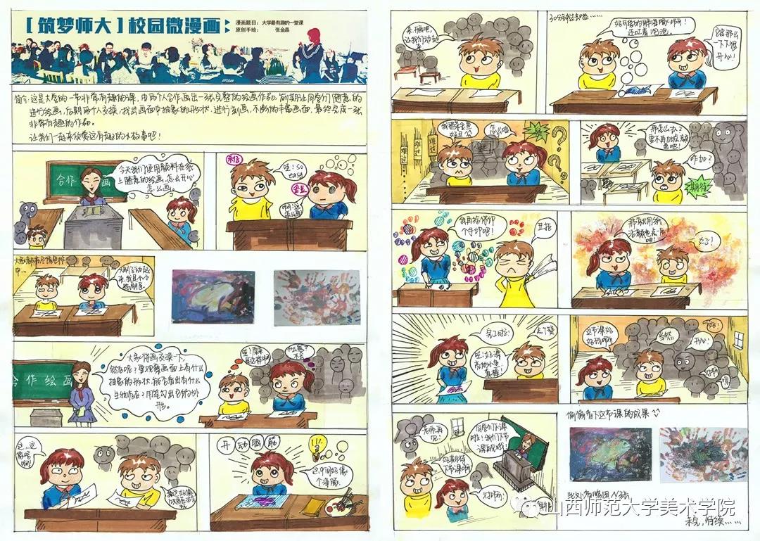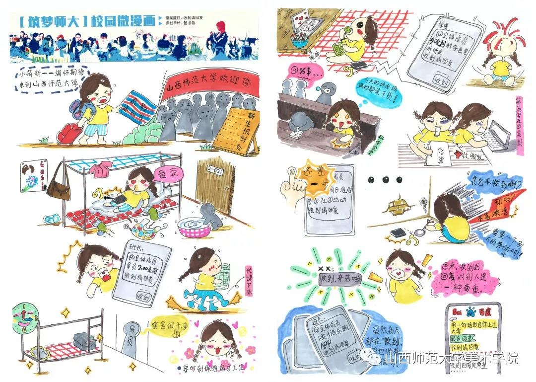 在17级视觉传达专业的《插画设计》课程中,《插画设计》课堂教学改革课题组接到山西师大60周年校庆主题的艺术创作项目,经过研讨,导师们决定将两种创作方式引入《插画设计》课堂教学,一是“筑梦师大”校园微漫画,主题性多格漫画原创绘制。二是“创新奋进 筑梦师大”大型拼贴海报的课堂创作。