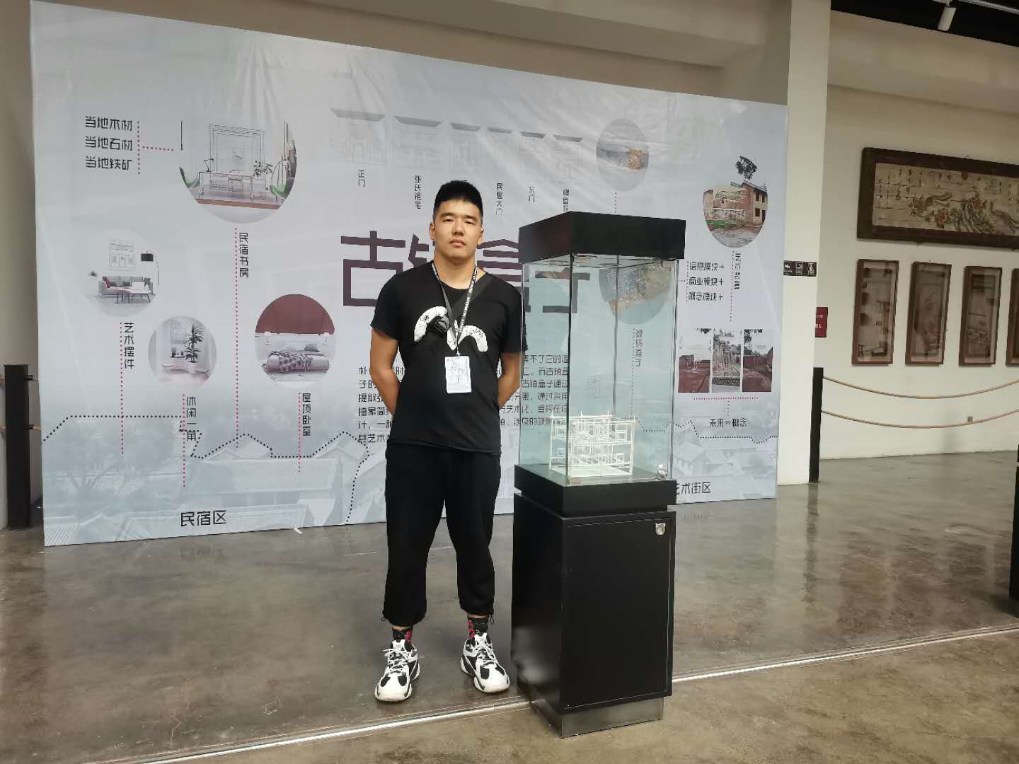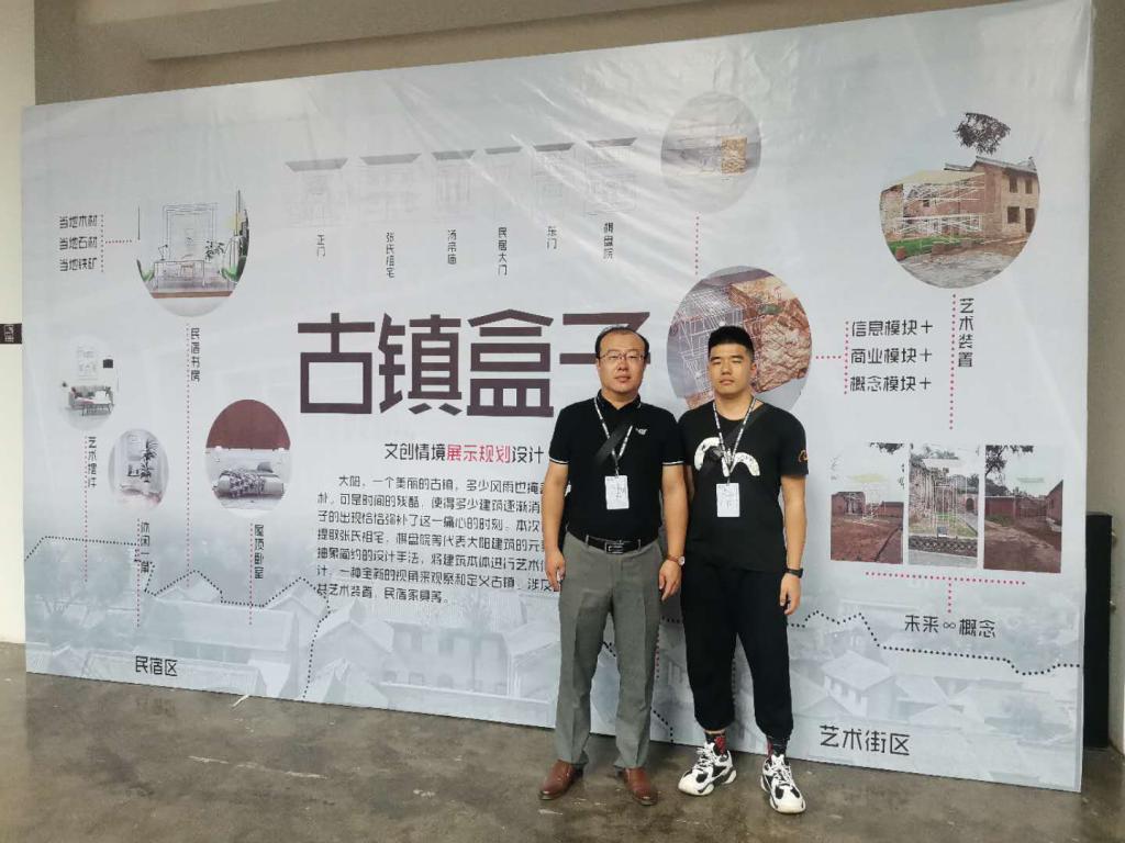 学生和宇翔与作品《古镇盒子——文创情景展示规划设计》合影