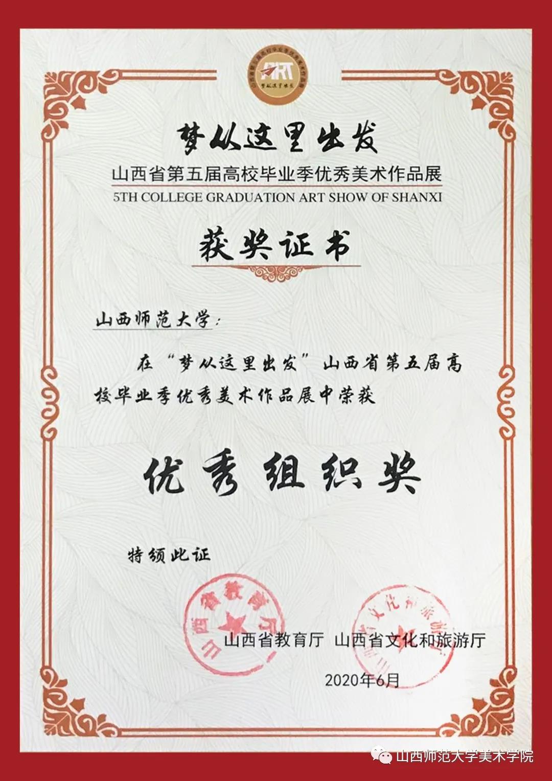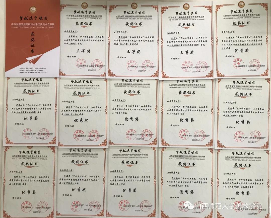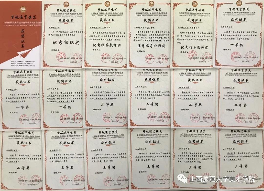 本届美展分为毕业作品展、“众志成城抗疫情,翰墨丹青写初心”主题展览、高校文创展三个展览板块,全省45所高校参加,共征集到作品1300余幅(件)。我校师生作品最终在本届毕业季美术作品展中荣获一等奖4项、二等奖6项、三等奖9项、优秀奖11项。