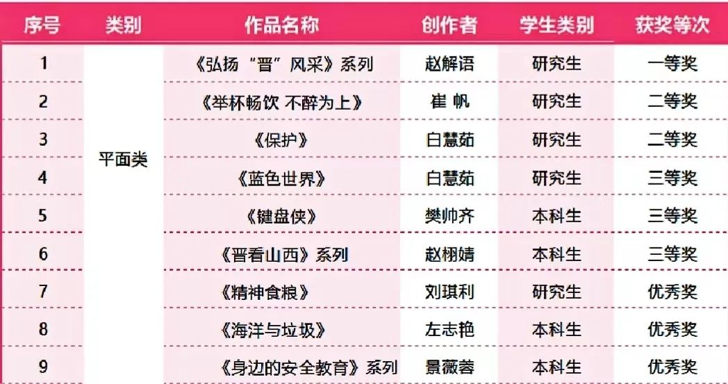 学子喜获平面类一等奖1项,二等奖2项,三等奖3项,优秀奖3项。