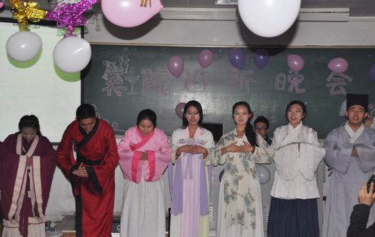 朝歌汉服社也为欢迎新生奉献了一场独特魅力的汉服T台秀。这是本次晚会的一大亮点,汉服社的社员们通过生动地舞台表演形式,弘扬了纯善纯美又充满神秘的民族传统服饰——汉服!学院学生会主席高盛,也为新生奉唱歌曲《归》,再一次点燃晚会的热情。整场晚会歌曲、舞蹈、相声及观众游戏互动等节目缤纷精彩,尽显大学生多姿多彩的青春活力与高涨激情,使入学新生感受和体会到同人动漫