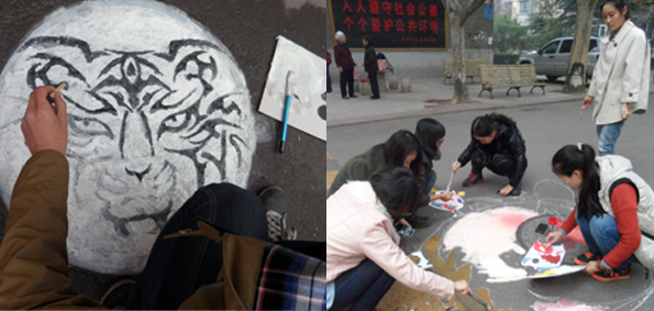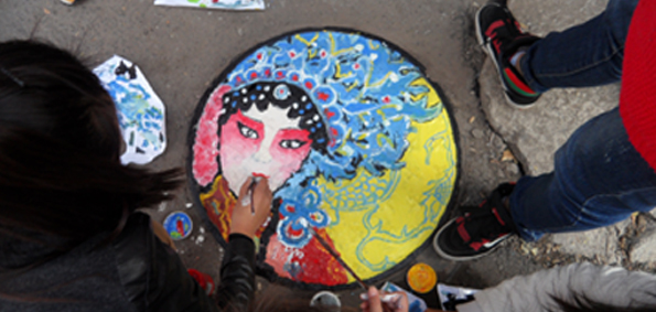 学生60多人自发组织,利用课余时间,以附近林荫小道上的井盖为创作源,通过艺术构思、整体设计、长廊策划,精绘出一幅幅精美图画,使原本不起眼的一个个井盖,变成了大学校园一道道亮丽的风景。据介绍,该创作由美术空间和民间美术两个社团发起,共计对校园北区近30个井盖进行了加工。包括卡通人物、个性图案、篮球图案、京剧脸谱等多种图案。其中,京剧脸谱作为文化国粹和该校的传统专业,备受过往师生关注,很多人纷纷在此驻足留念。