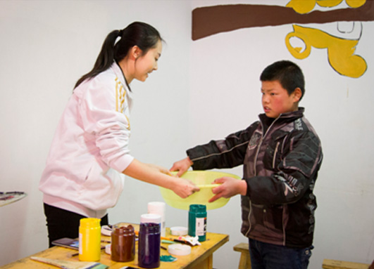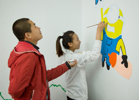 志愿者和特教小同学们分工合作,齐心协力,圆满完成了此次墙绘任务。面对着稍显复杂的图案时,志愿者们更是展现出了专注与耐心,务求更加精美地完成工作。学校的教室、走廊顿时成了色彩缤纷的童话世界,给这些折翼的小天使们带来一个美丽的环境。在绘画的过程中,美院学子与小朋友们愉快的交流互。,在活动结束后,同学们和小朋友们留下了纪念的照片。
