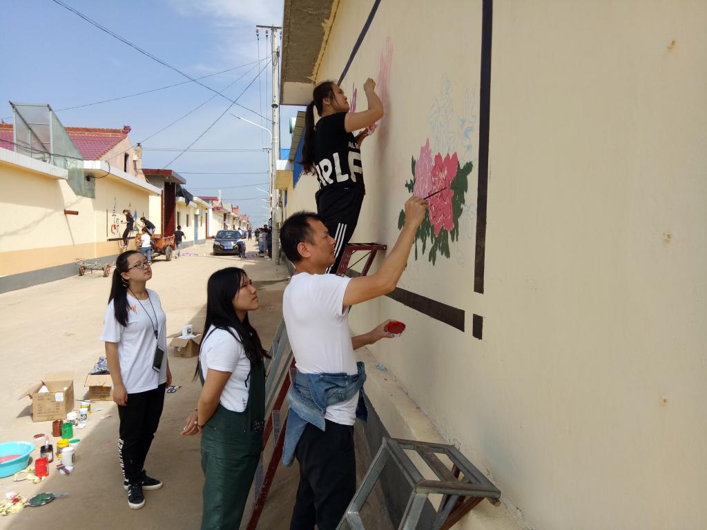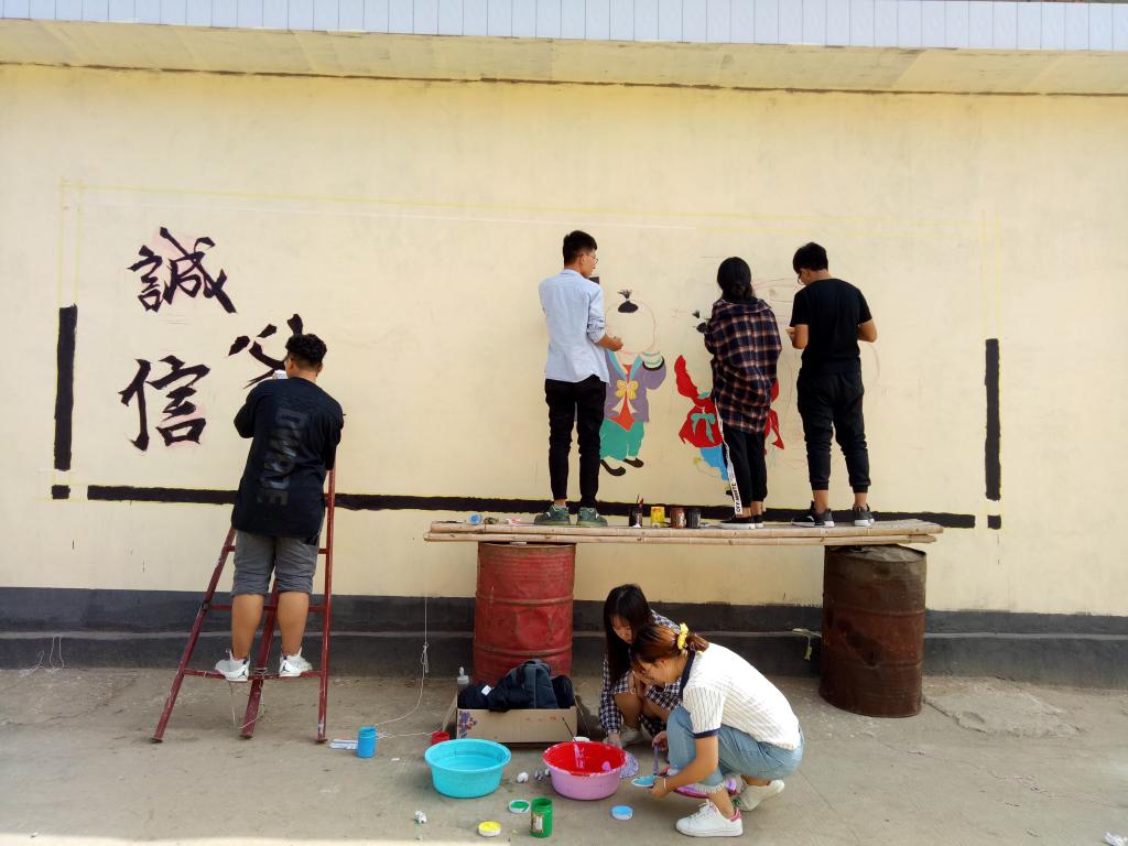 当地负责人为大家介绍了村里的情况和此次社会实践的具体工作并与齐增东老师结合村子的文化特色就具体实践细节进行了深入的探讨,并拟定了独具风格的墙绘绘制方案。志愿者们发挥专业优势,利用有限的时间巧妙构思、挥毫泼墨,将一幅幅装饰艺术画扮靓了墙面,给农村环境增添了新内涵。经过两天的努力,实践团队共绘制了以“脱贫攻坚”、“社会主义核心价值观”、“二十四孝”、“村风民风”和“建设新农村”等为主题的23幅作品,获得了村民们的一致好评。