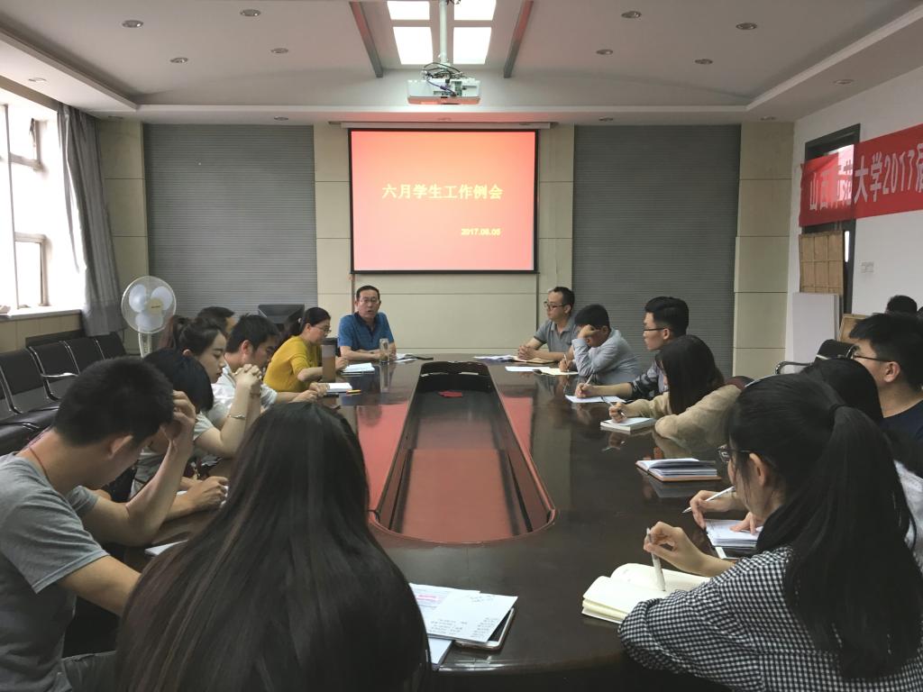 在学院会议室召开了6月学团工作例会。院党委副书记李豪、副院长郑煜川、本科生党支部书记贾娟、团委副书记杜丰之、辅导员吕金光、王涛以及全体学生干部参加了会议。会议由党委副书记李豪主持。