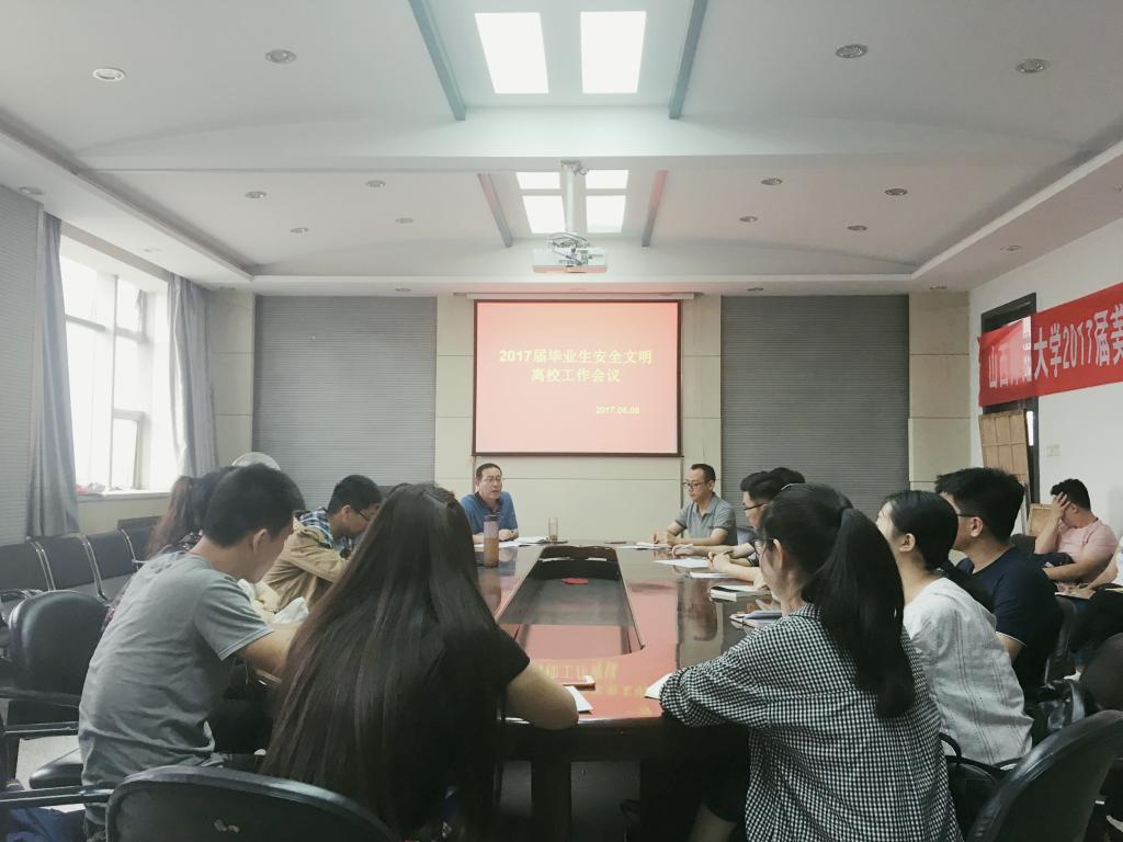 在学院会议室召开2017届毕业生毕业教育及安全文明离校工作会议。院党委副书记李豪、副院长郑煜川、本科生党支部书记贾娟、院团委副书记杜丰之、全体辅导员以及毕业班学生干部党员参加了会议。会议由党委副书记李豪主持。