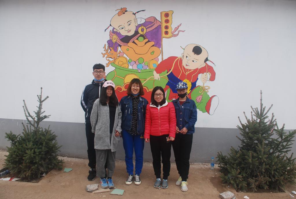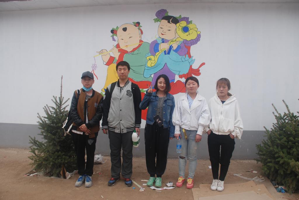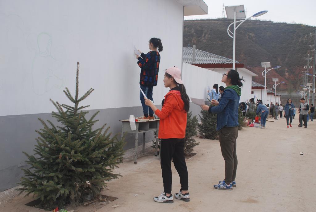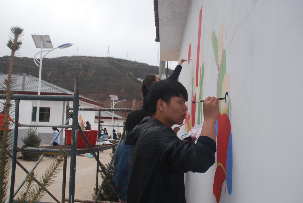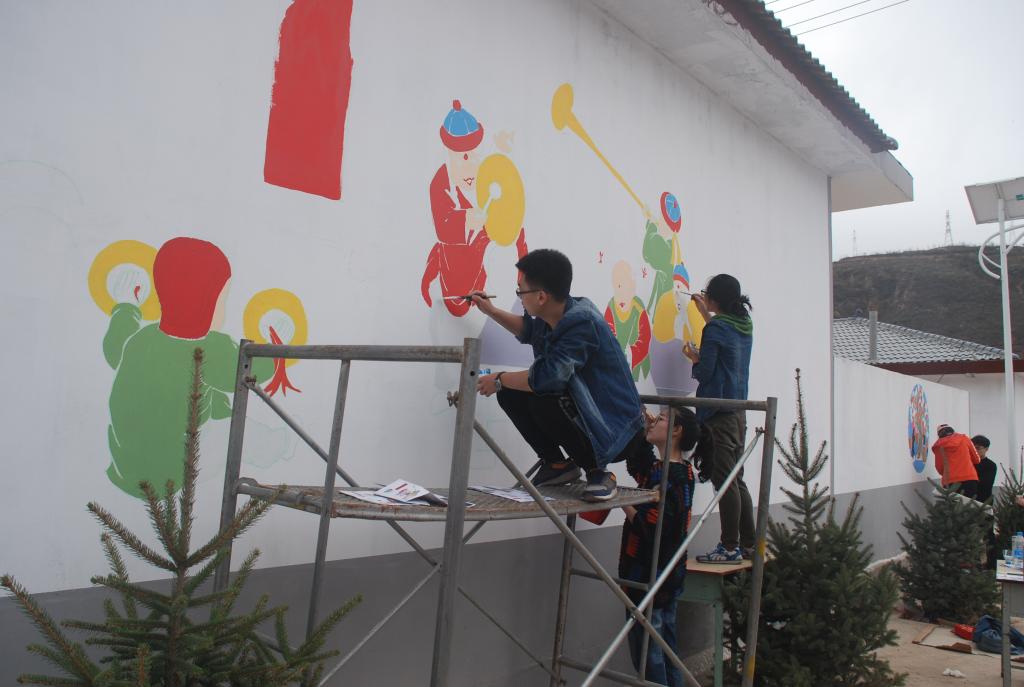 两天中,同学们用自己手中的画笔,凭借过硬的专业知识,按照指导教师张一平的方案设计,实地测量,认真构图,绘草图,调颜料,勾勒,上色,分组进行,井然有序。没有一个人叫苦,没有一个人喊累,没有一个人嫌脏,没有一个人说冷,脚手架上爬上爬下,高强度高标准高质量工作,硬是在短短的两天中把一幅幅精美的作品呈现在村民面前,“画的好”、“师大的学生就是水平高”、“好娃娃,能吃苦”,赞扬声一片。
