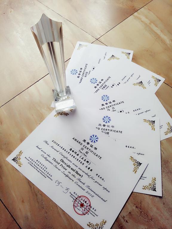 参赛队员不畏严寒,精心雕琢,克服生理、心理双重挑战,在长3米、宽3米、高3米的人造雪块上进行雪雕创作,经过三天的连续加班奋战,圆满完成作品《正与斜》的创作,赋予了立方体雪块新的生命力。