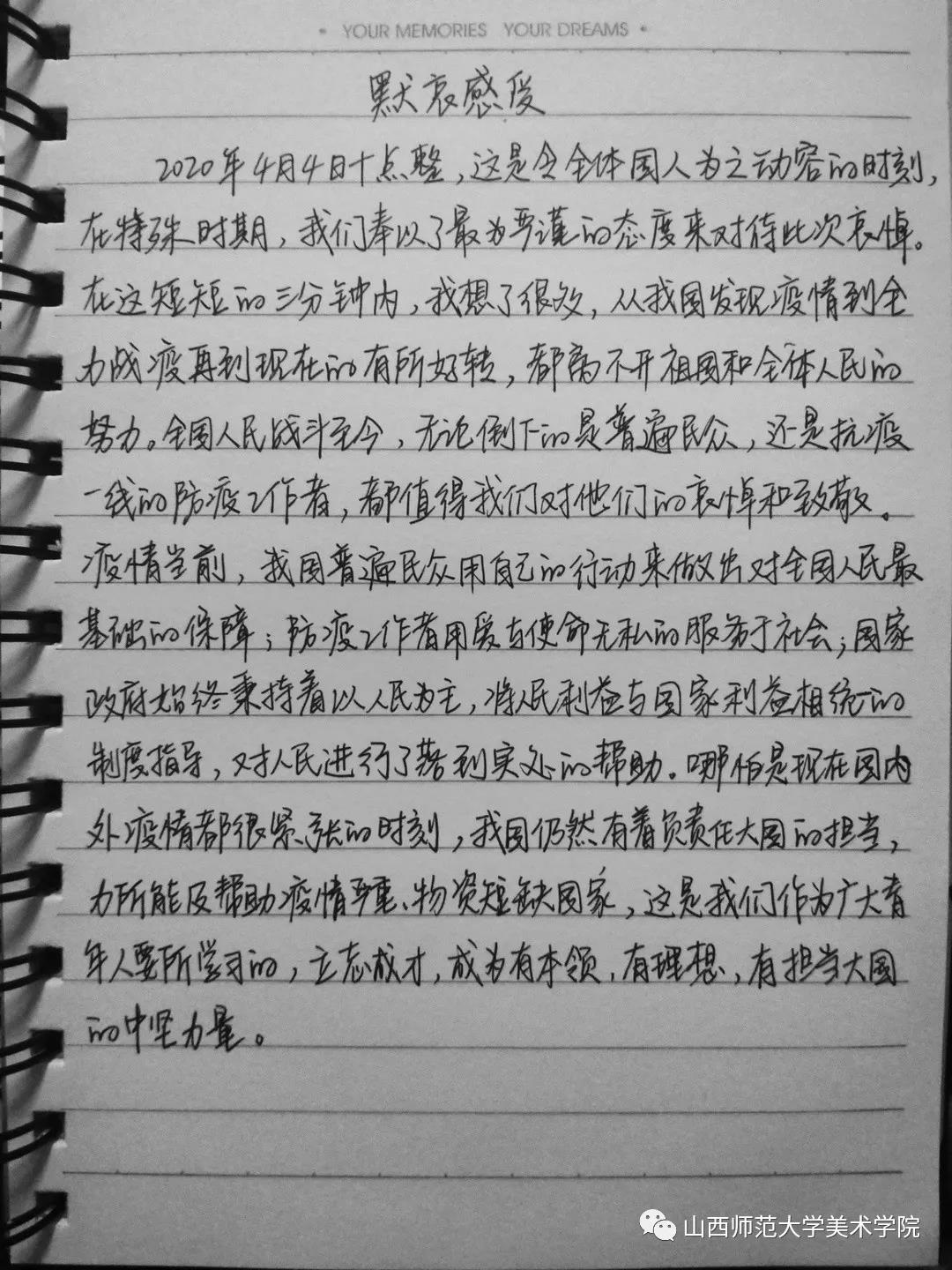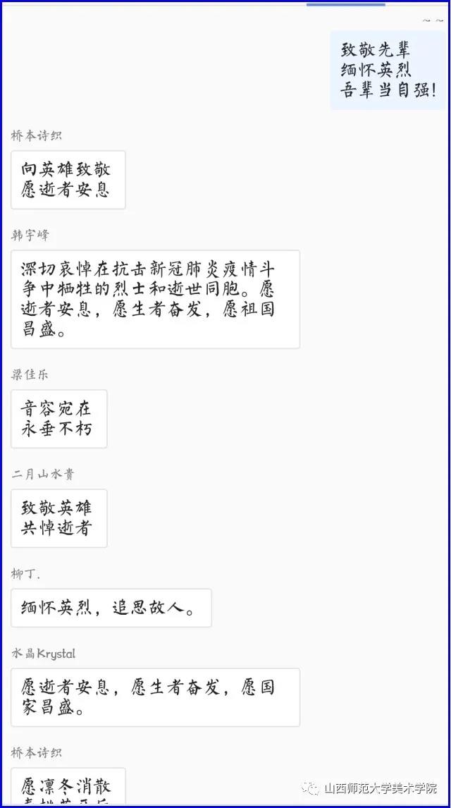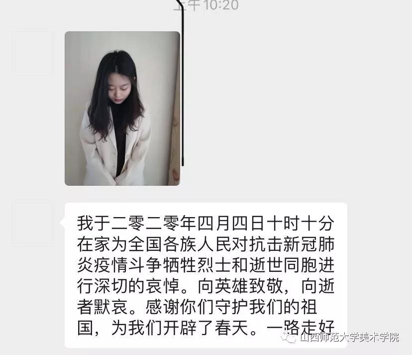 团委积极响应国家及学校号召,组织全体学生居家开展“缅怀先烈,深切哀悼”主题团日活动,同学们通过微博转发、微信转发、观看直播等方式了解有关抗击疫情的英雄事迹和感人故事,并开展了“网上祭英烈”活动,参与云祭奠,进行祭文留言。2020年4月4日上午10时整,全体同学在家立正默哀三分钟,为在抗击疫情中牺牲的烈士及逝世同胞深切哀悼并致以最崇高的敬意。哀悼结束后,同学们积极发表了自己的感想,表达了对英雄的感恩和敬仰之情。