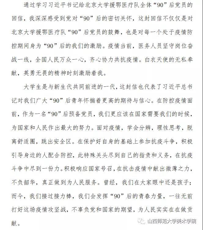 习近平在回信中表示,在新冠肺炎疫情防控斗争中,你们青年人同在一线英勇奋战的广大疫情防控人员一道,不畏艰险、冲锋在前、舍生忘死,彰显了青春的蓬勃力量,交出了合格答卷。广大青年用行动证明,新时代的中国青年是好样的,是堪当大任的!