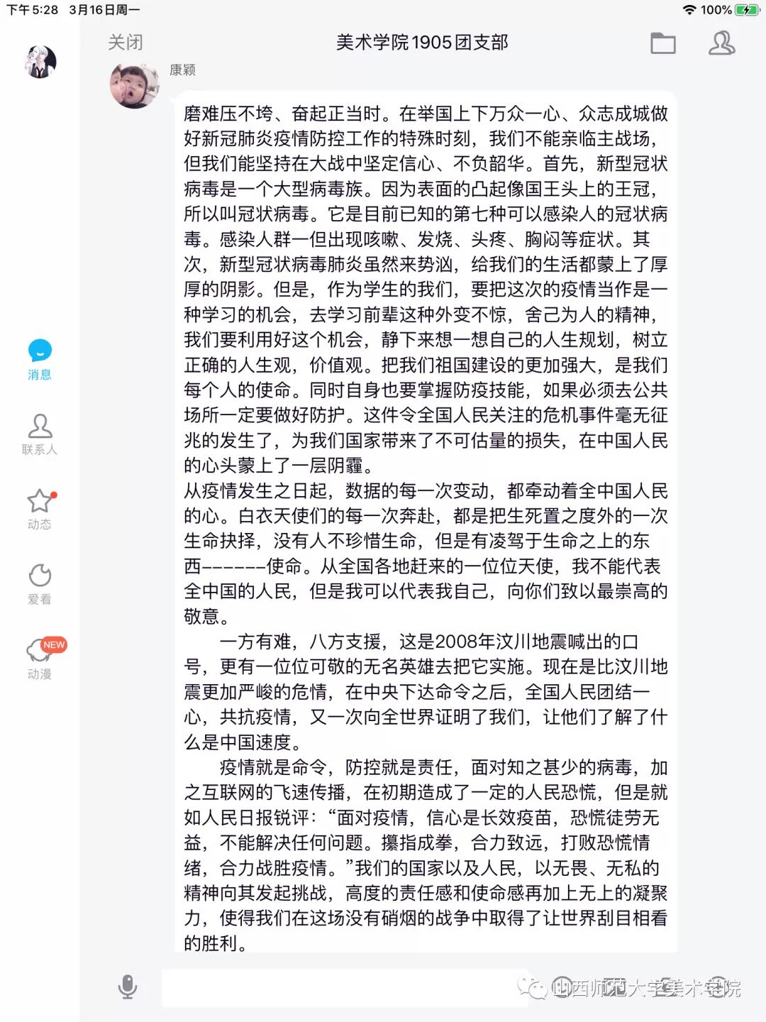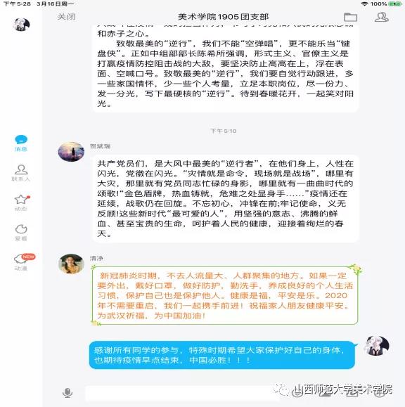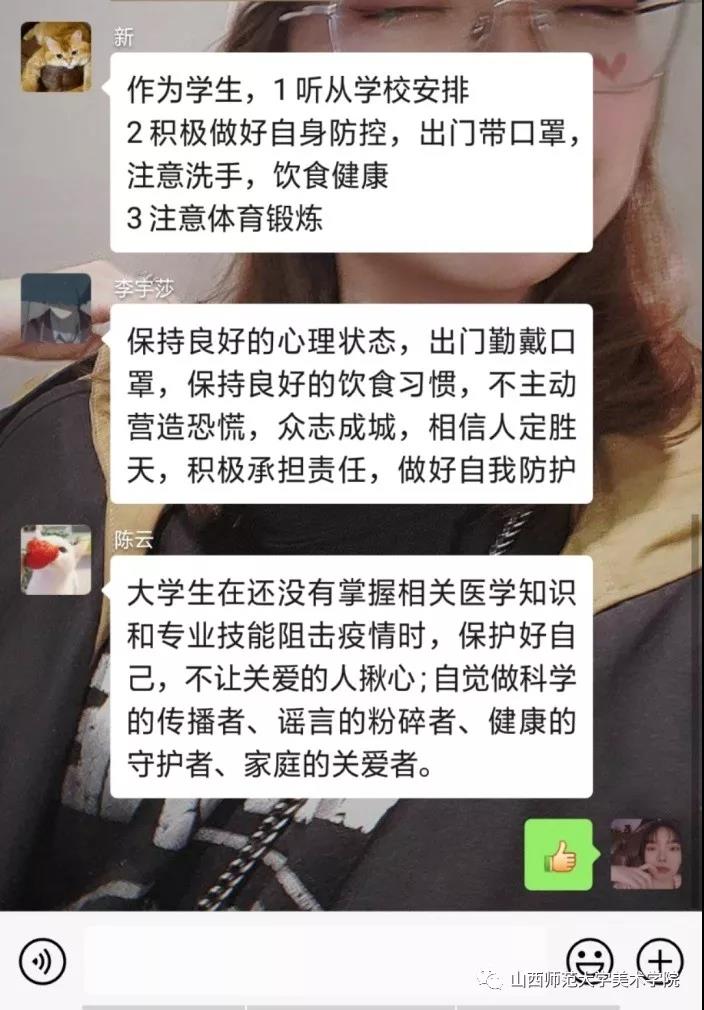 活动中,各团支部通过各种线上方式积极组织学习研讨,同学们互相分享了有关防控疫情的知识和防御病毒的小妙招,有的发起了有关于“疫情期间真实的事件”线上讨论,还有的通过收看抗疫新闻报道,及时了解抗击疫情的进展情况,学习疫情防治方法。活动期间,各团支部同学通过互动、讨论、交流等形式积极参与防疫抗疫知识学习,并且分享了自己的疫情防控期间的学习和生活情况。