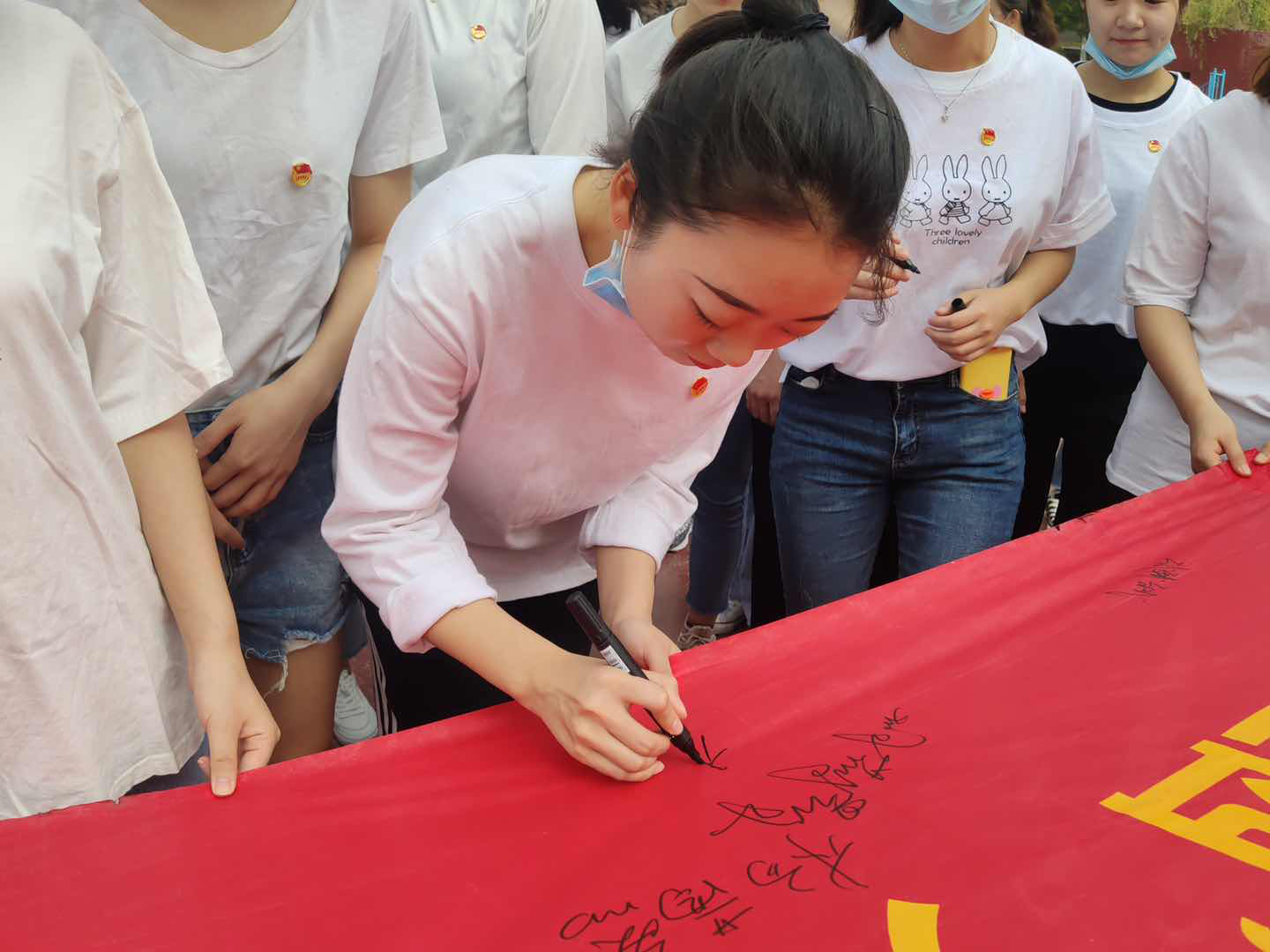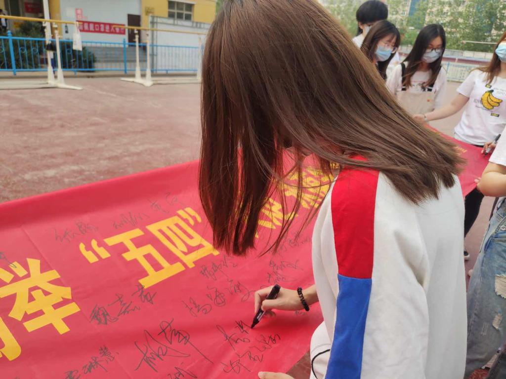 活动第二项,全体返校团员青年在青春宣言条幅上签名,同学们以书言志,在写有“高举五四火炬,永葆先进本色,争当青年先锋”的条幅上签上自己的名字,表明自己实践“中国梦”的决心,用实际行动奏响五四运动主旋律。