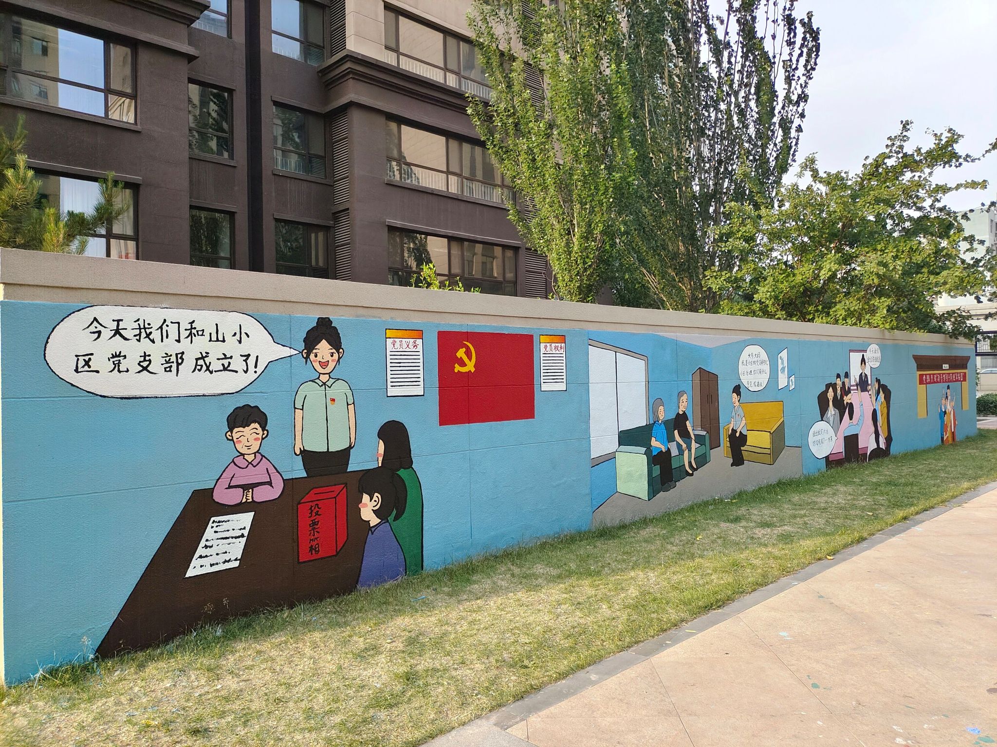 活动现场,志愿者们分工明确,很快投入到自己的工作中。他们充分发挥自己的专业技能,巧妙地将党的知识融入墙绘作品中,将墙绘赋予了实际意义。让社区居民以更形象更直接的方式了解到党的知识。经过一天的努力,志愿者们完成了约25平米的墙绘作品。