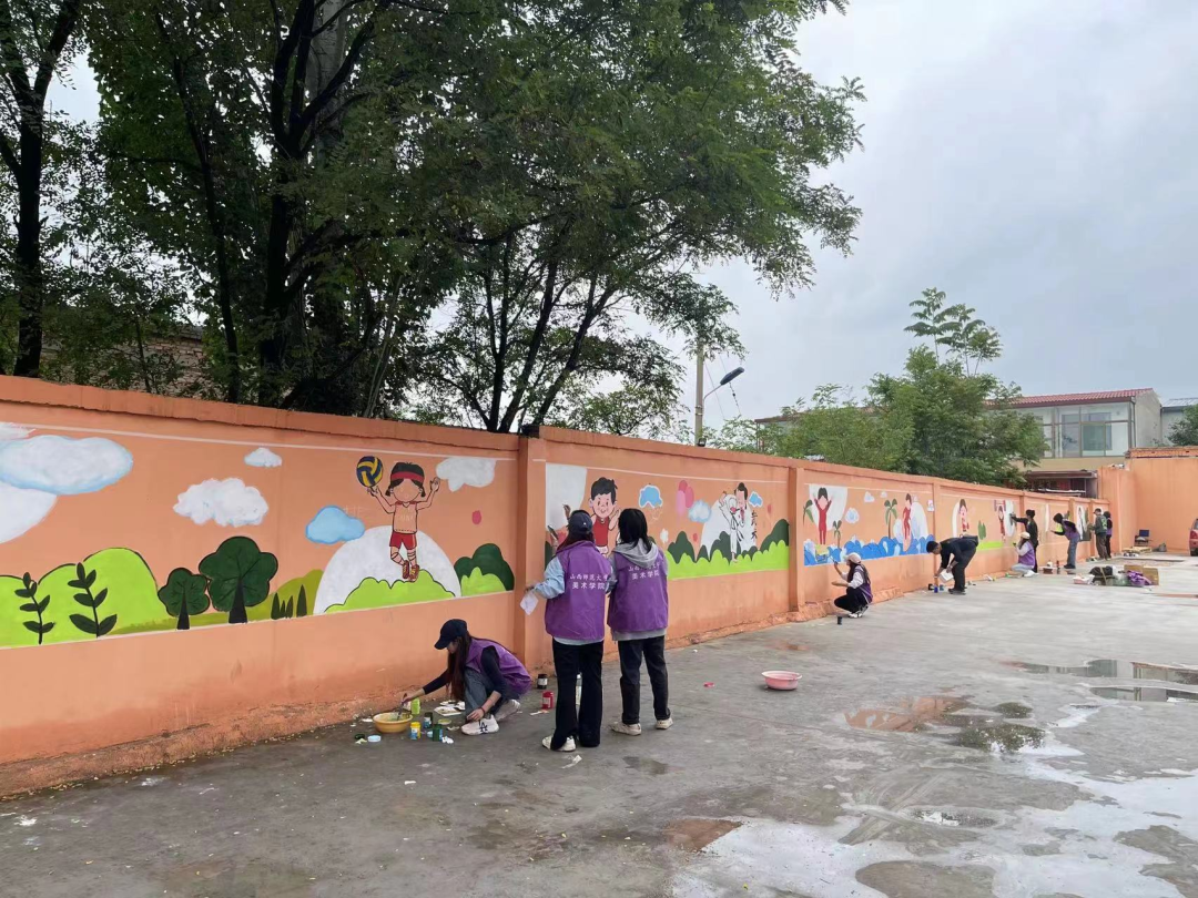 为进一步推动学习贯彻习近平新时代中国特色社会主义思想主题教育走深走实,在专业特色和专业热能发挥上求实效、促提升,深入践行“我为群众办实事”,5月30日,同人动漫 研究生党支部师生党员组成艺术服务队赴乌金山镇北砖井小学开展了“行走的思政课”校园墙绘服务乡村振兴特色党建活动。