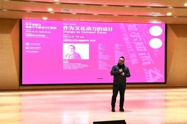 此次讲座,韩湛宁教授围绕“作为文化动力的设计”主题,以海报设计作品为主分别介绍了平面设计的光焰、深圳文化的感召力、积极的文化实践三个部分,其中涵盖了他本人部分书籍设计、品牌设计和文创设计作品,并向我们讲述了其作品背后的故事。从作品中可以窥探出他自身设计艺术发展脉络,即从纯粹的设计语言探索,演变为为城市文化服务,再到主动以设计介入城市文化,最终以自己的方式引领文化艺术的发展。他本人在艺术实践活动中的设计之道在于不断在传统与现代性相融合的过程中探索自我,以敏锐的视角,富有实验性的图形语言,表达对当下社会、文化和艺术的思考。在讲座中韩湛宁教授睿智真诚,娓娓道来,以学思结合的方式为我们讲述了一个个鲜活的设计案例,使我们深刻明白设计是有目的,需要我们去定义、解读、传播。